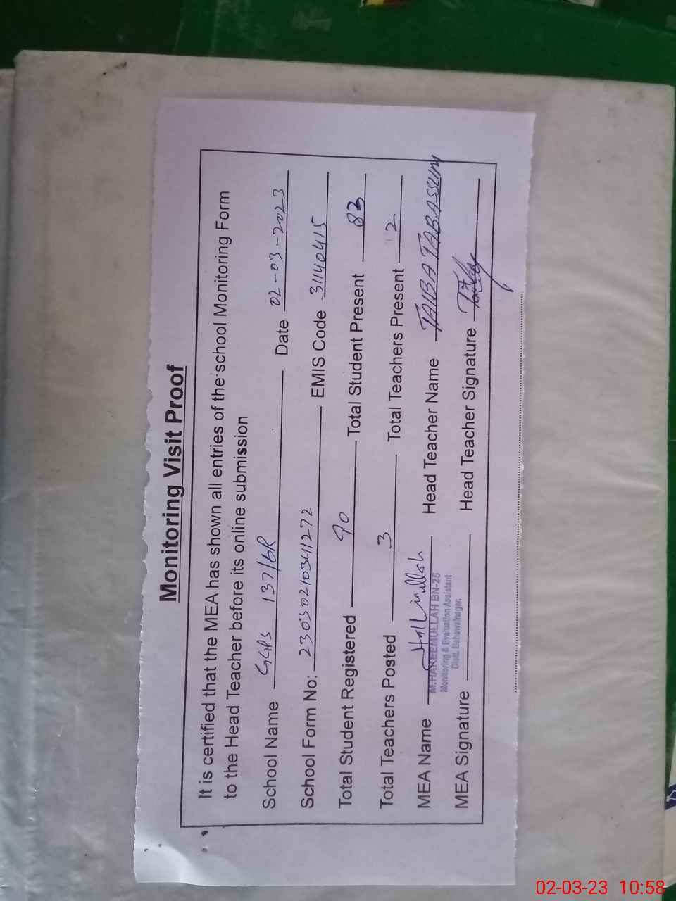 | Attendance Register | Head Teacher | MEA with School | Visit Proof |