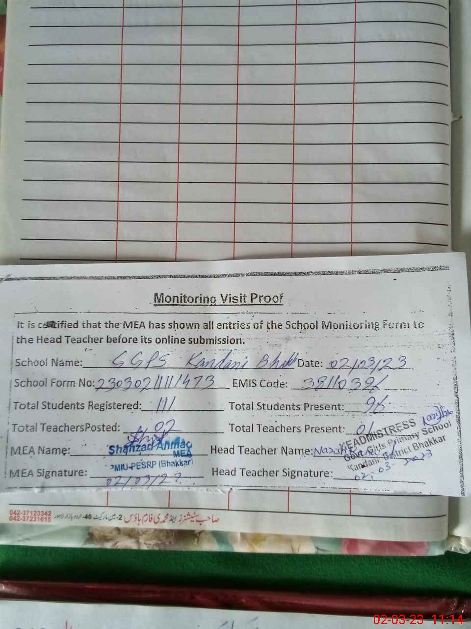 | Attendance Register | Head Teacher | MEA with School | Visit Proof |