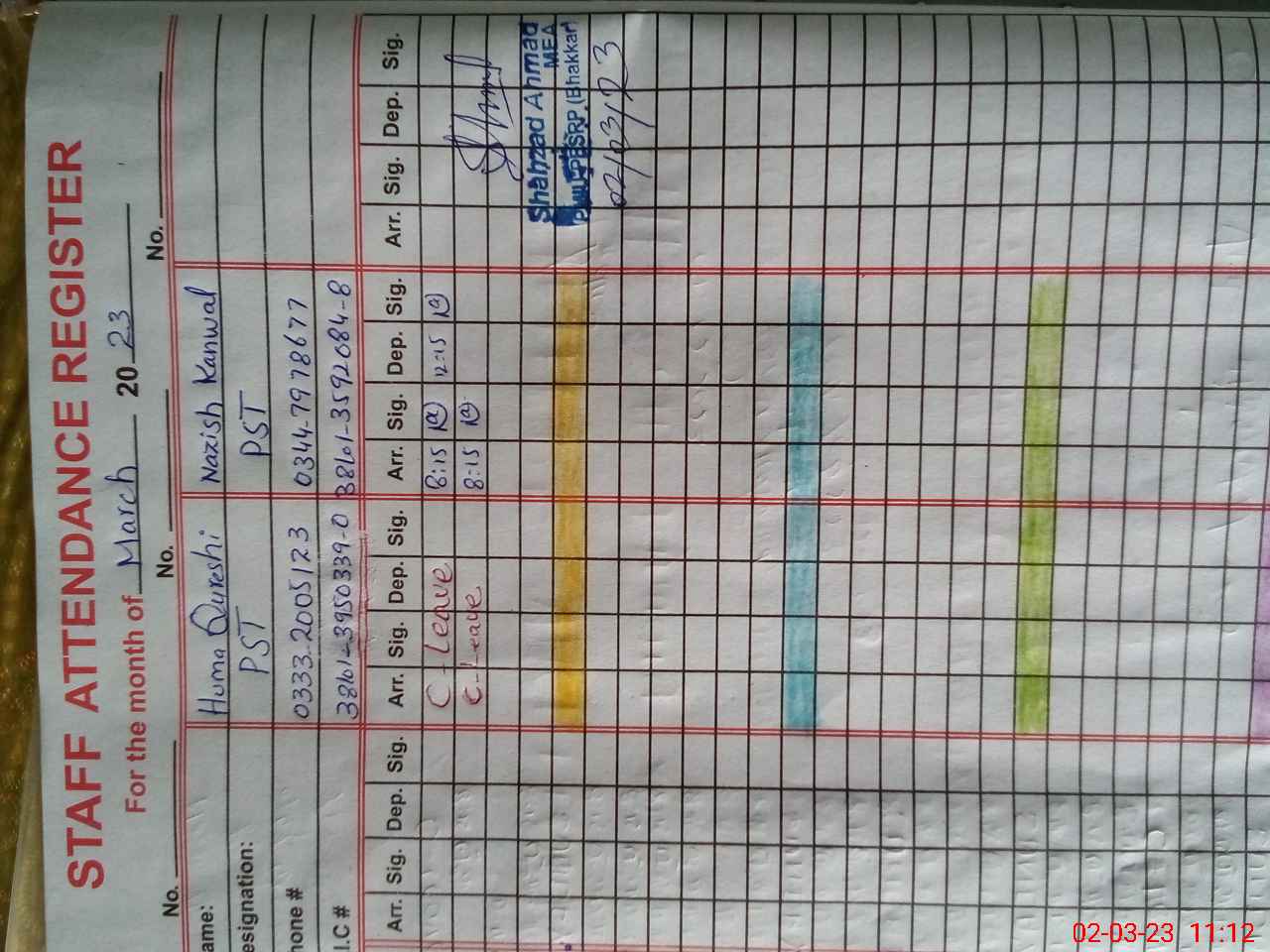 | CNIC | Full Name | Designation | R/C | Absence During Last Calender Month |