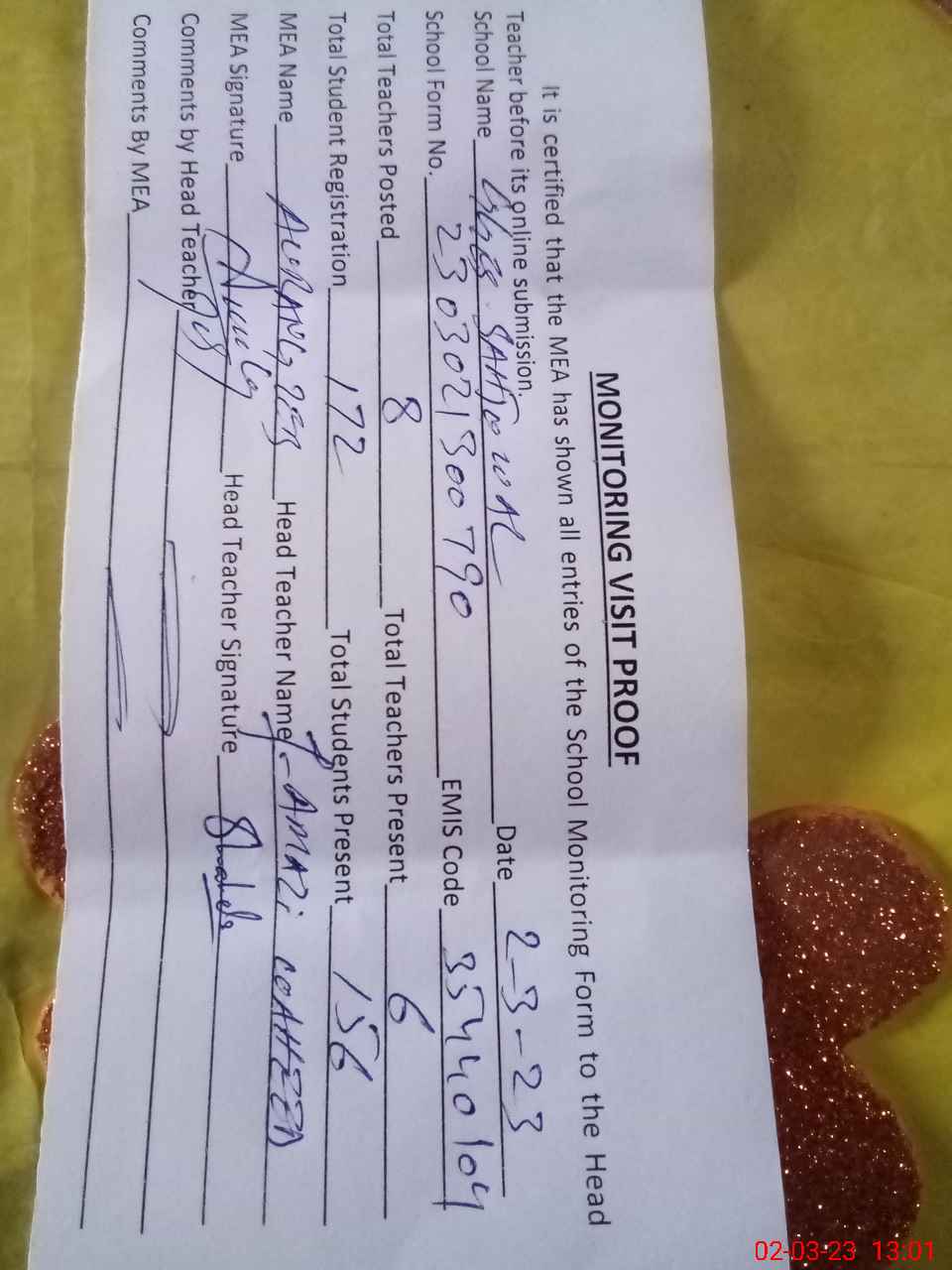 | Attendance Register | Head Teacher | MEA with School | Visit Proof |