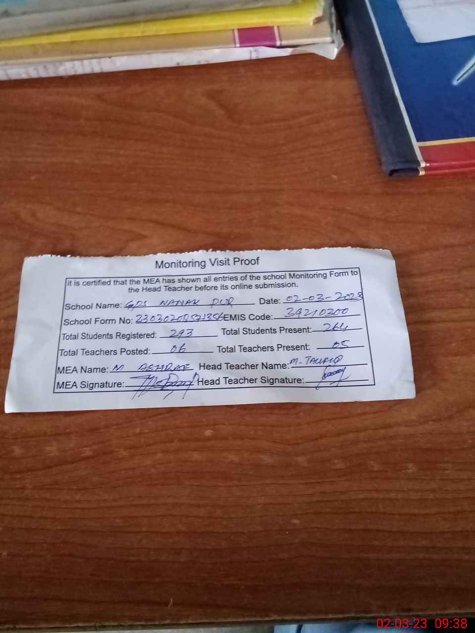| Attendance Register | Head Teacher | MEA with School | Visit Proof |