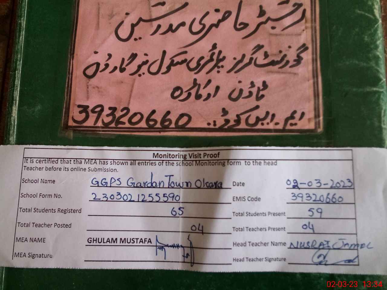 | Attendance Register | Head Teacher | MEA with School | Visit Proof |