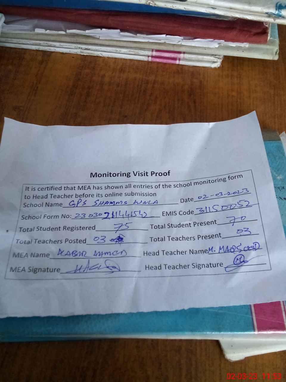 | Attendance Register | Head Teacher | MEA with School | Visit Proof |