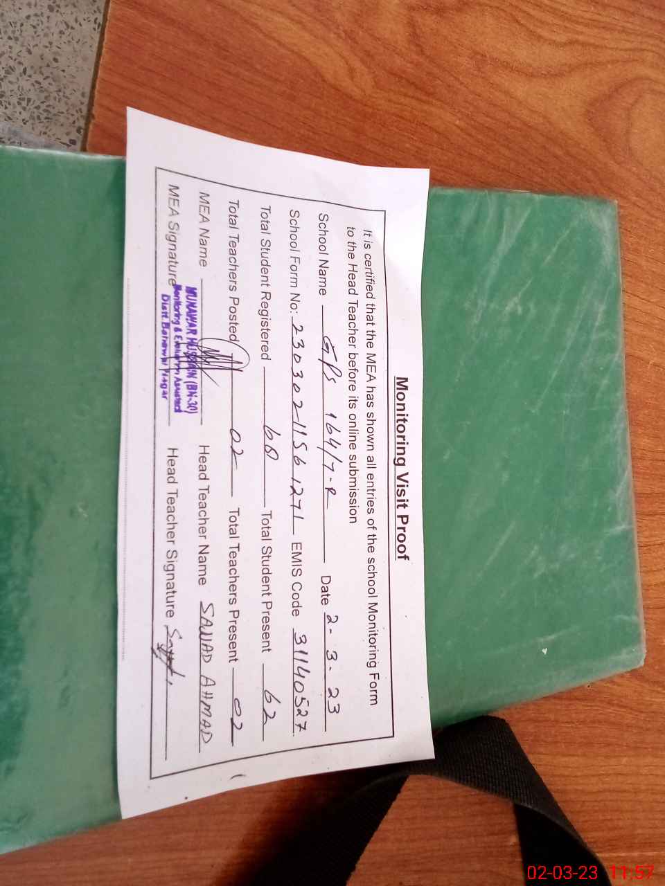 | Attendance Register | Head Teacher | MEA with School | Visit Proof |