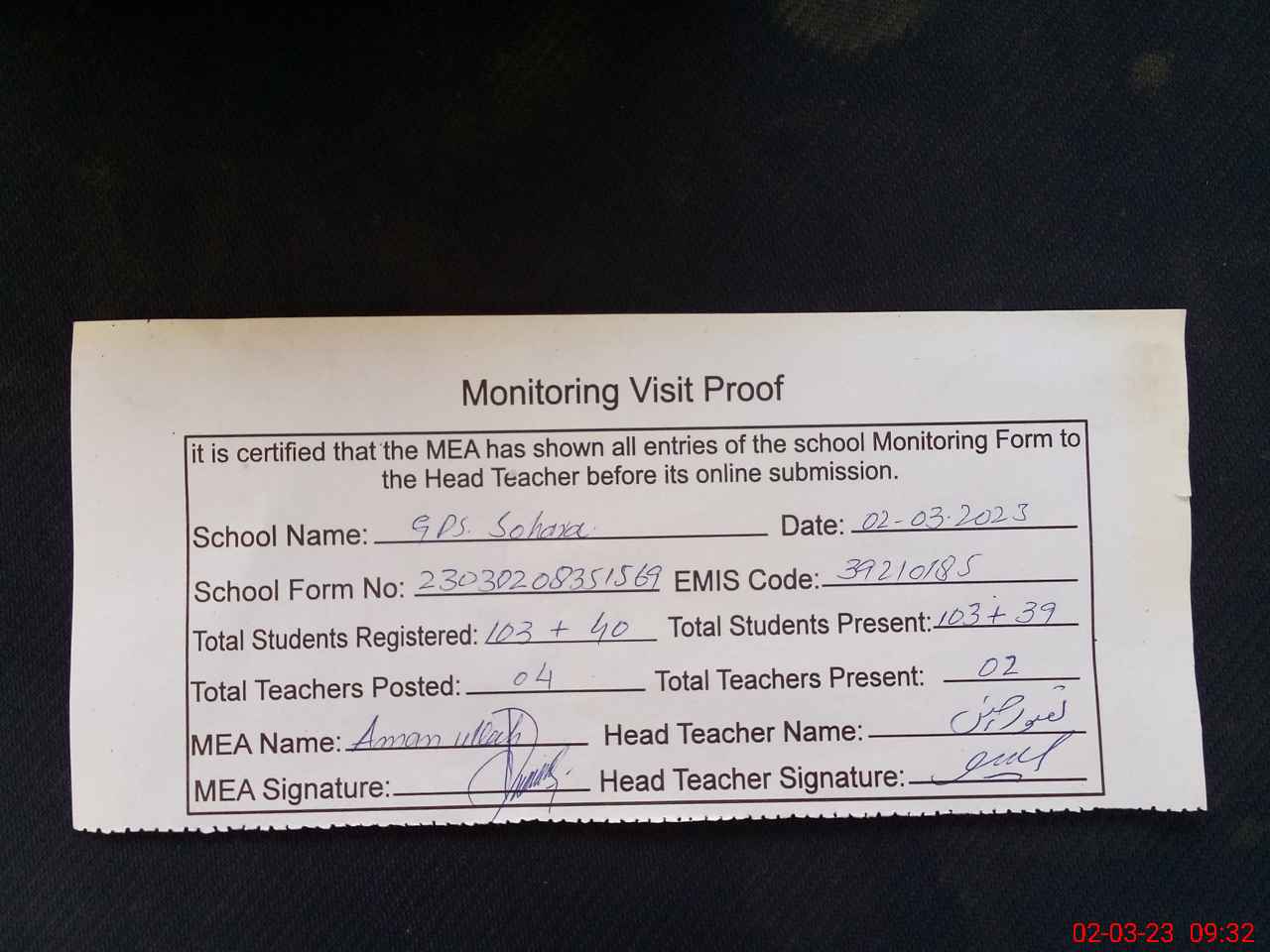 | Attendance Register | Head Teacher | MEA with School | Visit Proof |