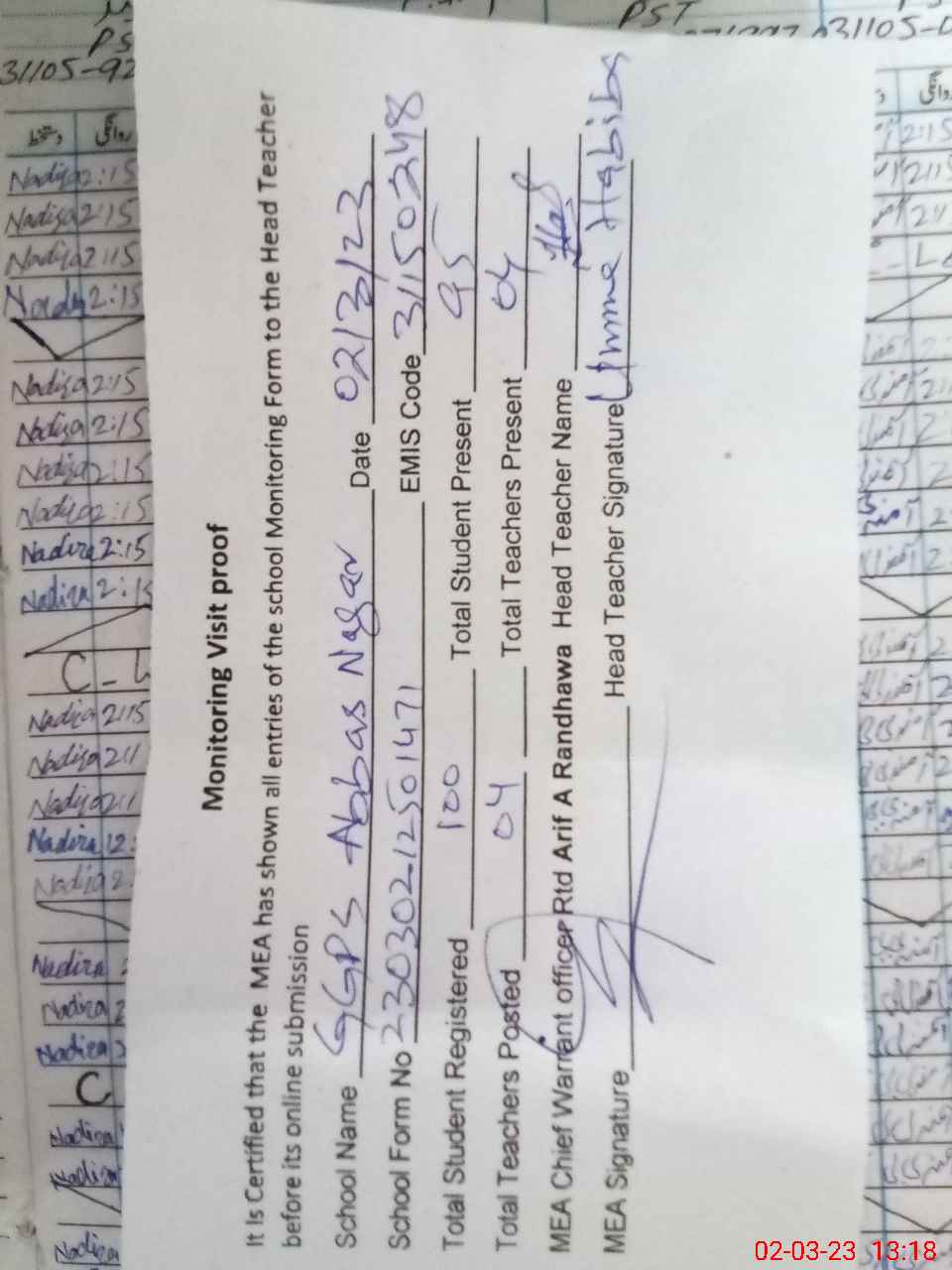 | Attendance Register | Head Teacher | MEA with School | Visit Proof |