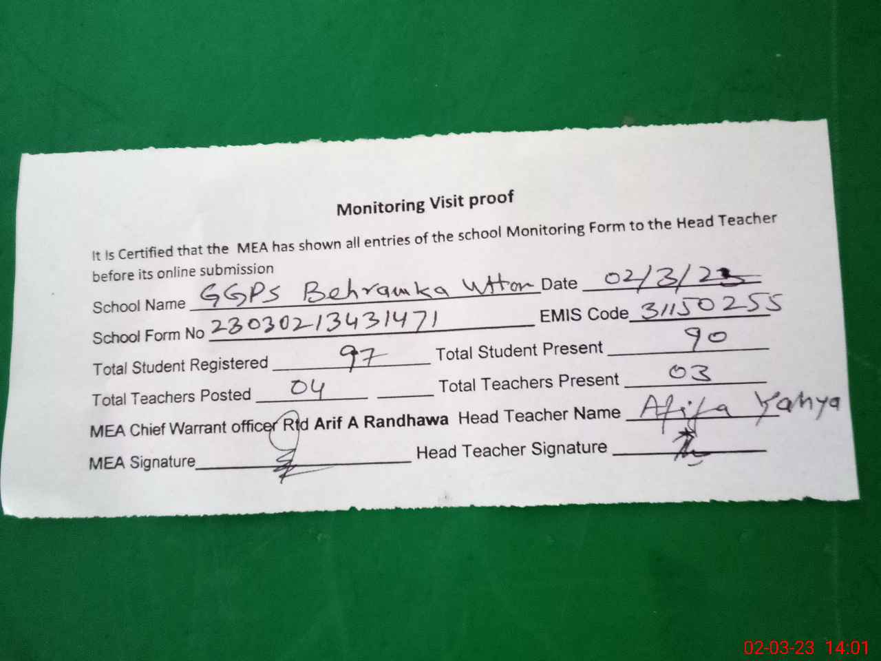 | Attendance Register | Head Teacher | MEA with School | Visit Proof |