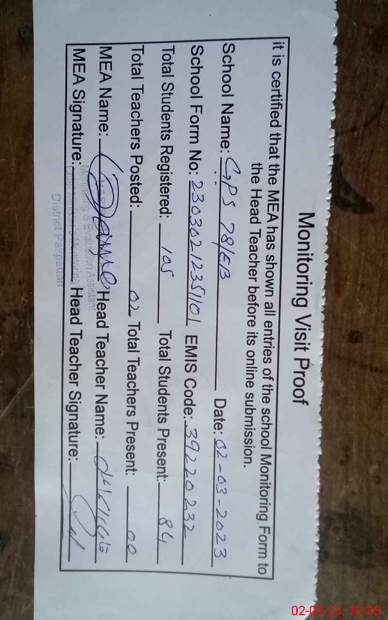 | EMIS Code: 39220232 | Name of School: GPS 78 EB ARIF WALA | |||