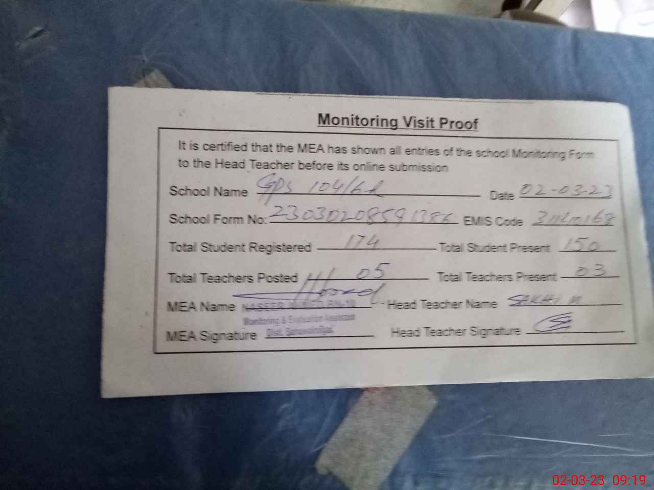 | EMIS Code: 31140168 | Name of School: GPS CHAK NO 104/6-R | |||