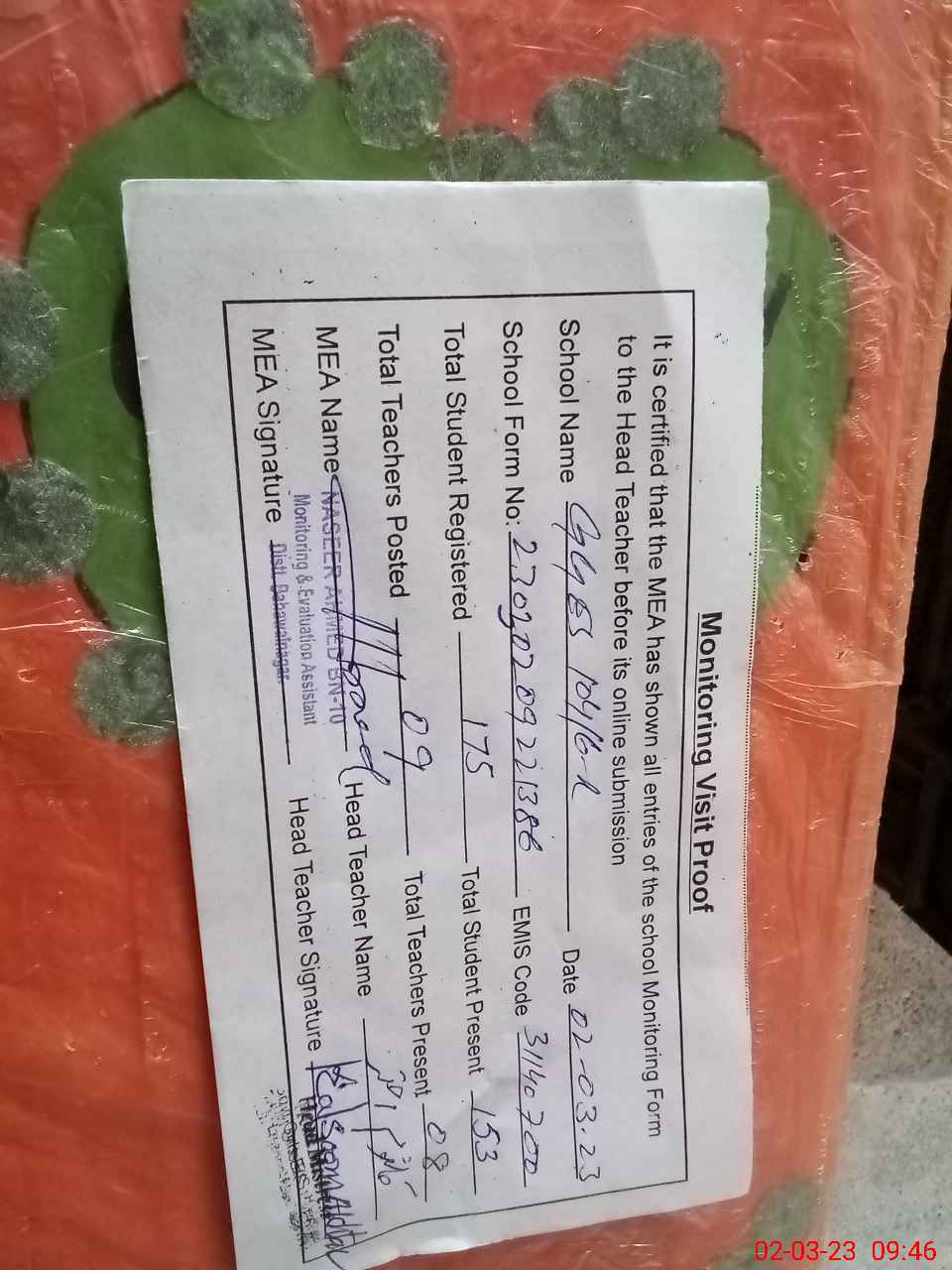 | Attendance Register | Head Teacher | MEA with School | Visit Proof |
