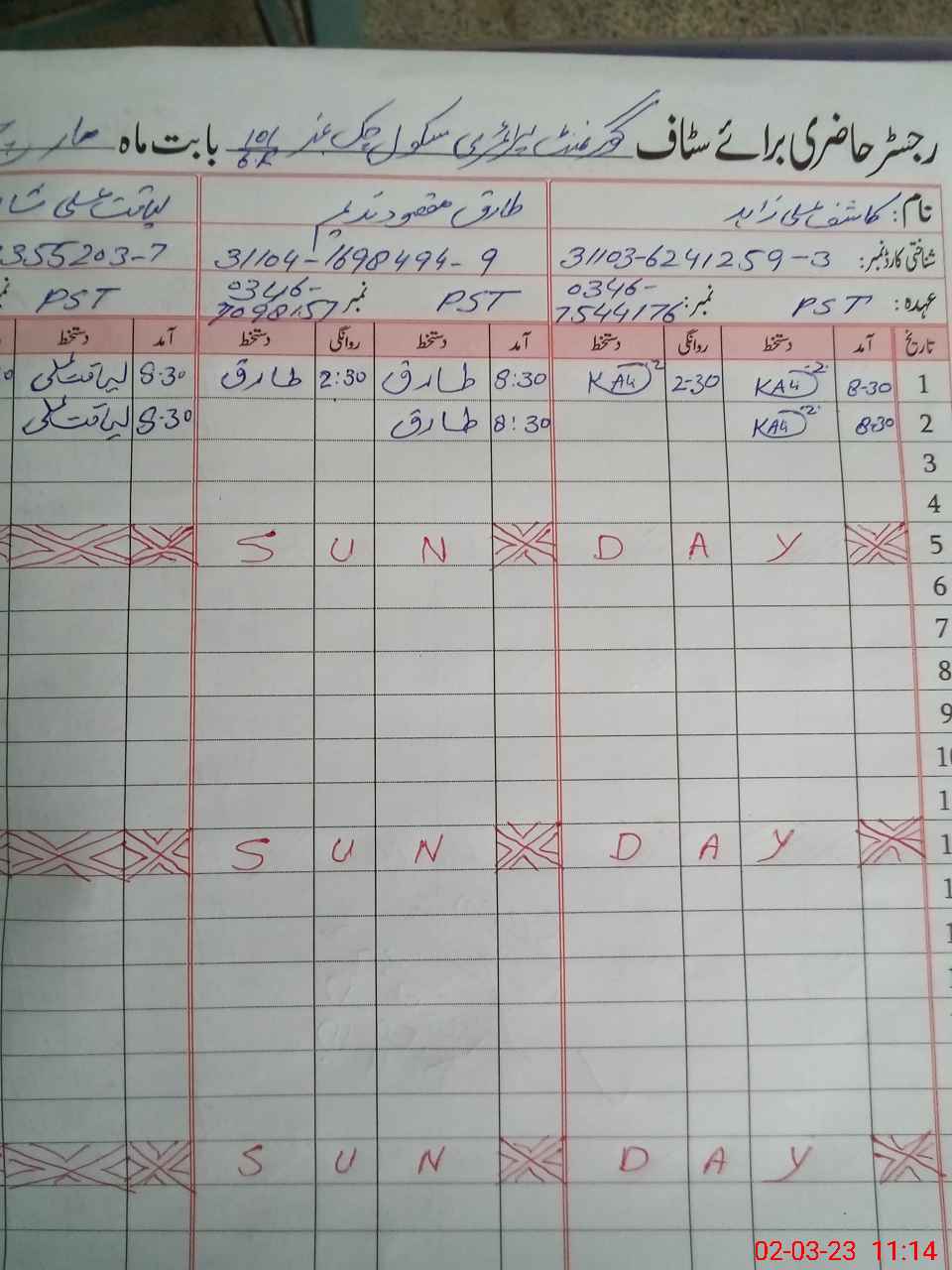 | CNIC | Full Name | Designation | R/C | Absence During Last Calender Month |