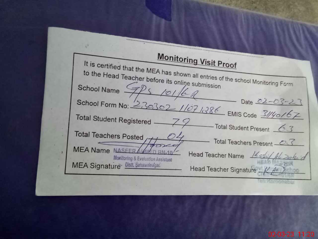 | Attendance Register | Head Teacher | MEA with School | Visit Proof |