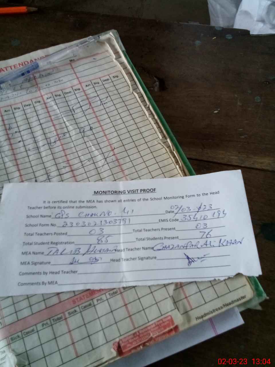 | Attendance Register | Head Teacher | MEA with School | Visit Proof |