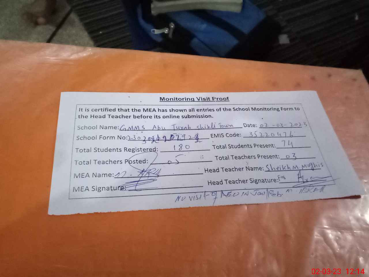 | Attendance Register | Head Teacher | MEA with School | Visit Proof |