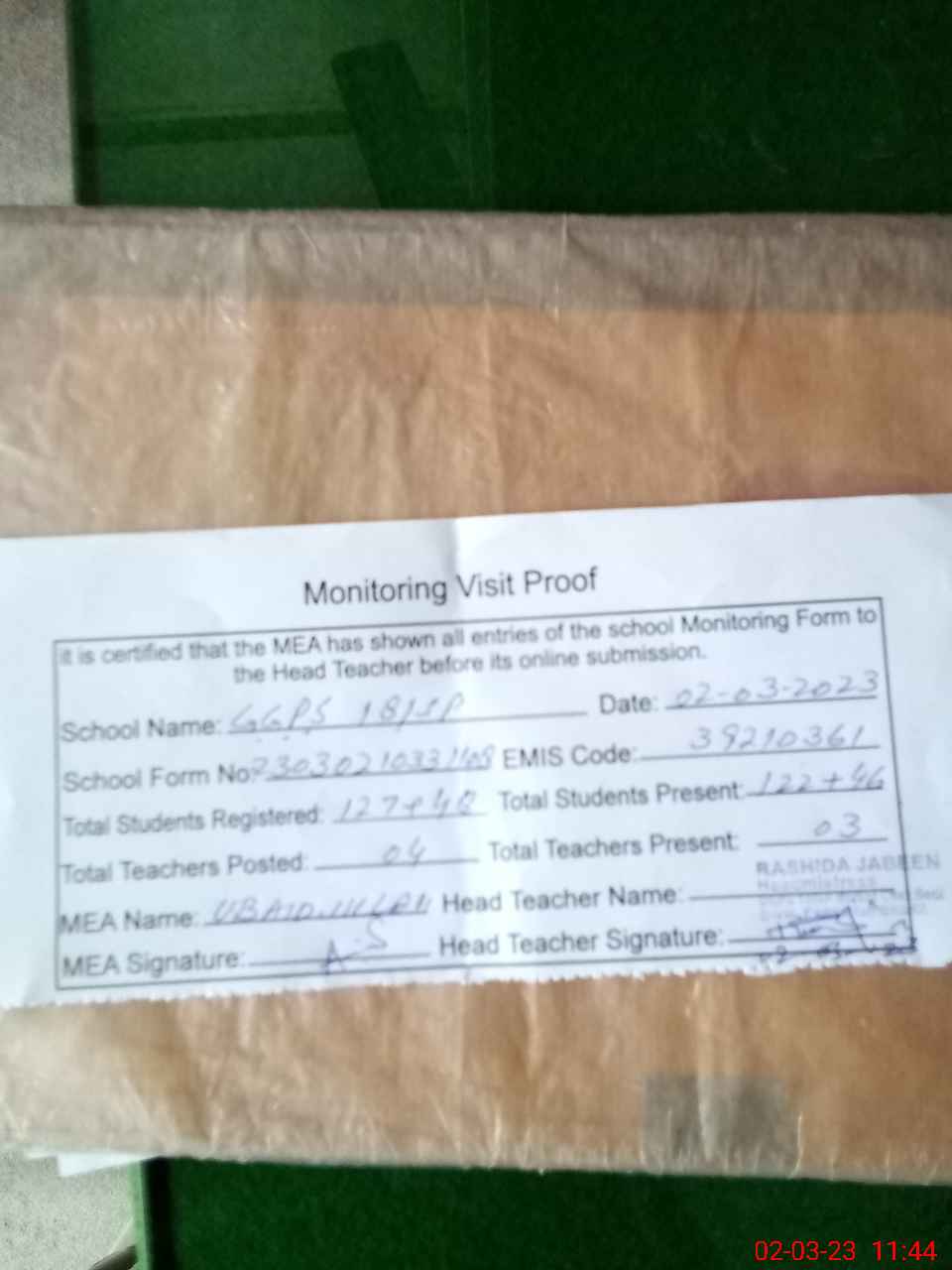 | Attendance Register | Head Teacher | MEA with School | Visit Proof |