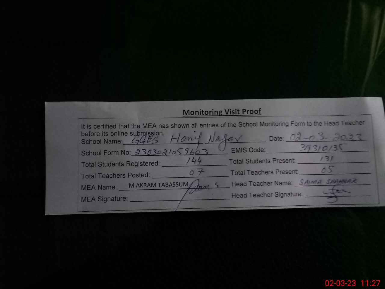 | Attendance Register | Head Teacher | MEA with School | Visit Proof |