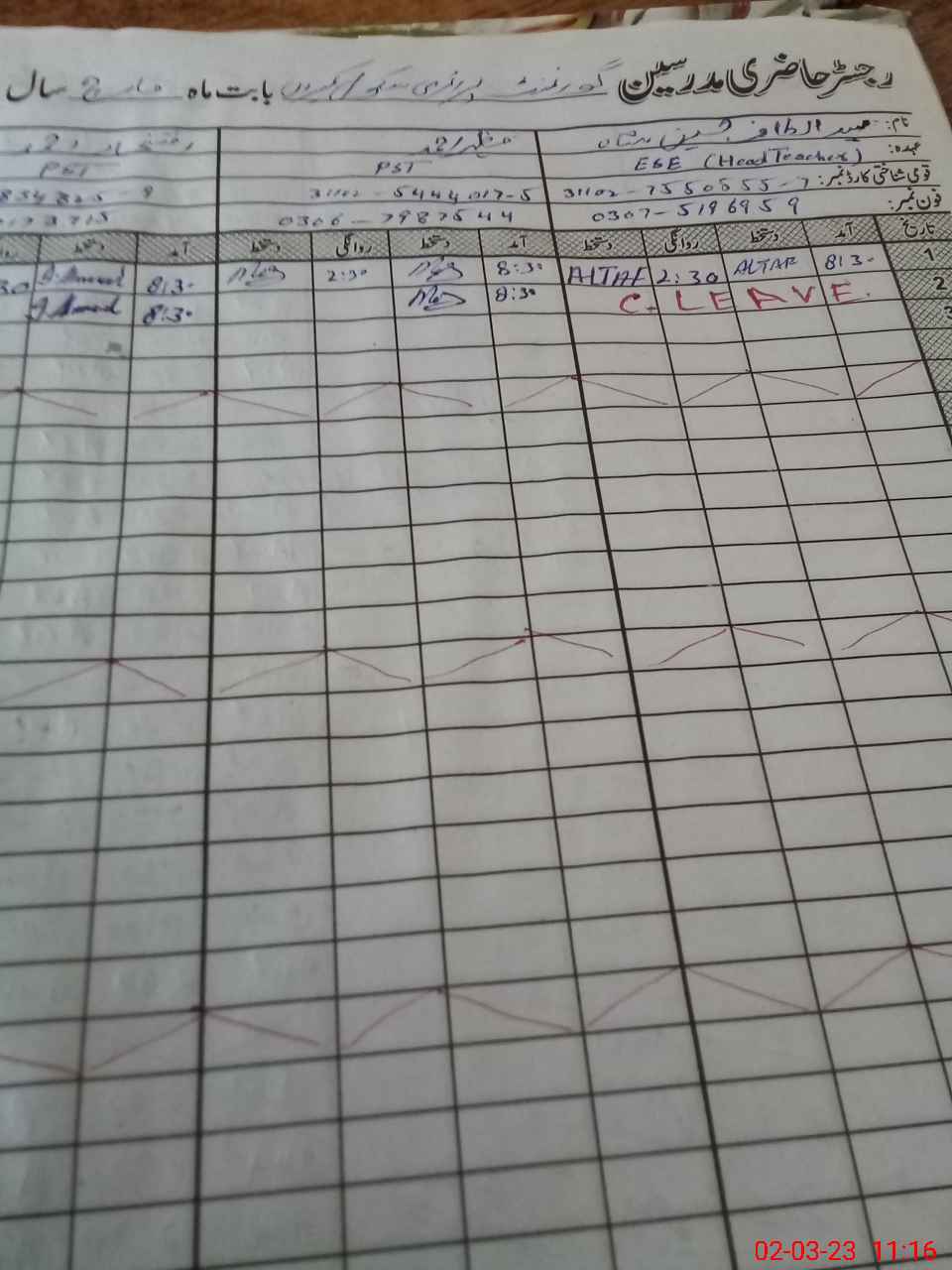 | Name: Sy**** Al**** Hu**** Designation: (School Headmaster's/Headmistress's) ESE Phone/Cell Number: 03**** |