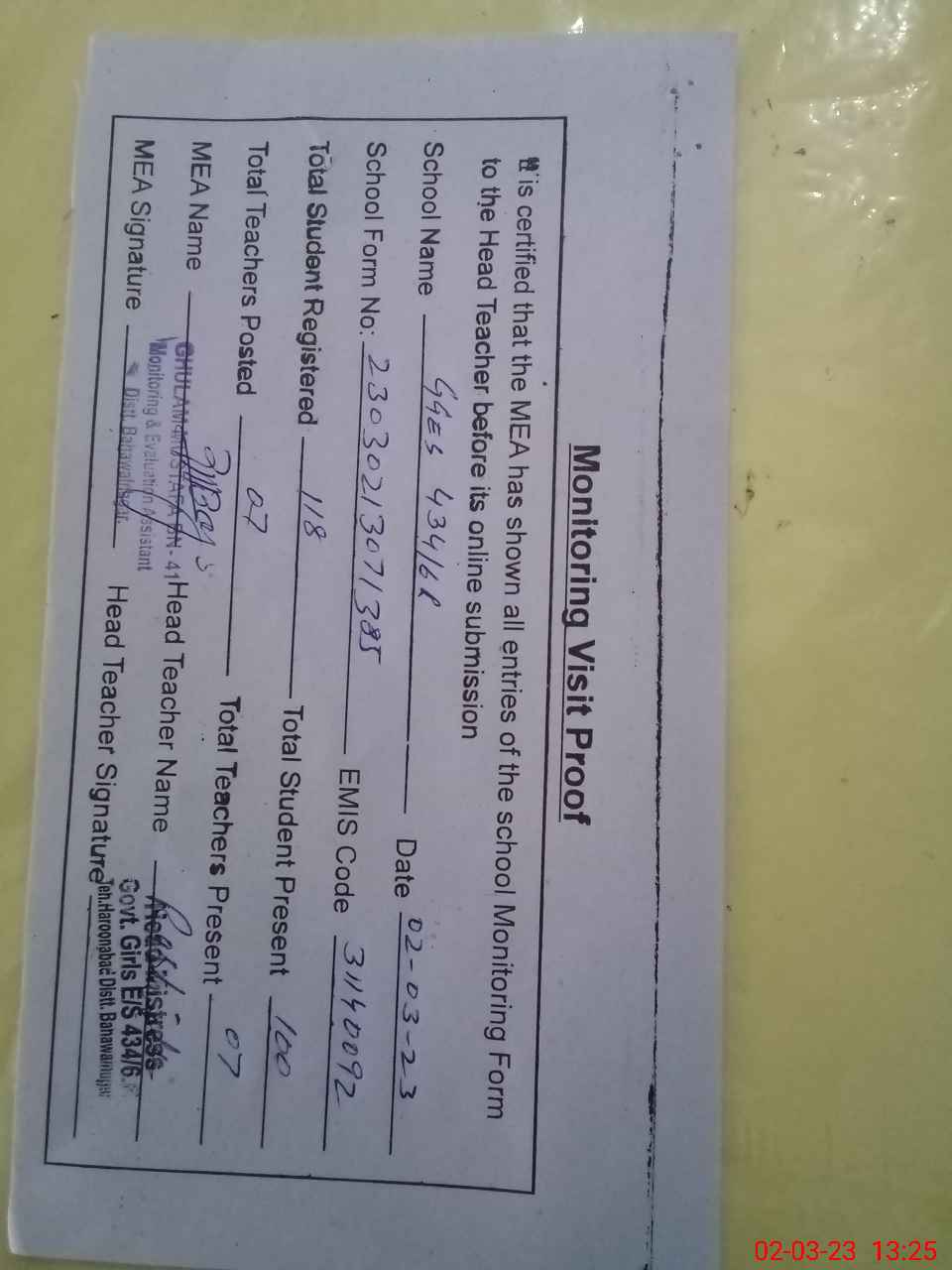 | Attendance Register | Head Teacher | MEA with School | Visit Proof |