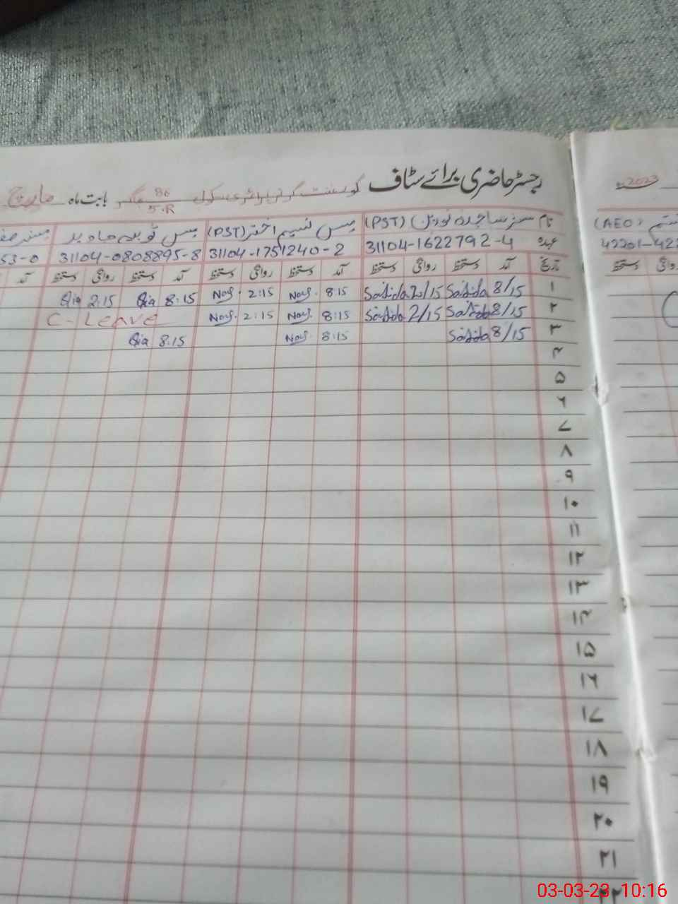 | CNIC | Full Name | Designation | R/C | Absence During Last Calender Month |