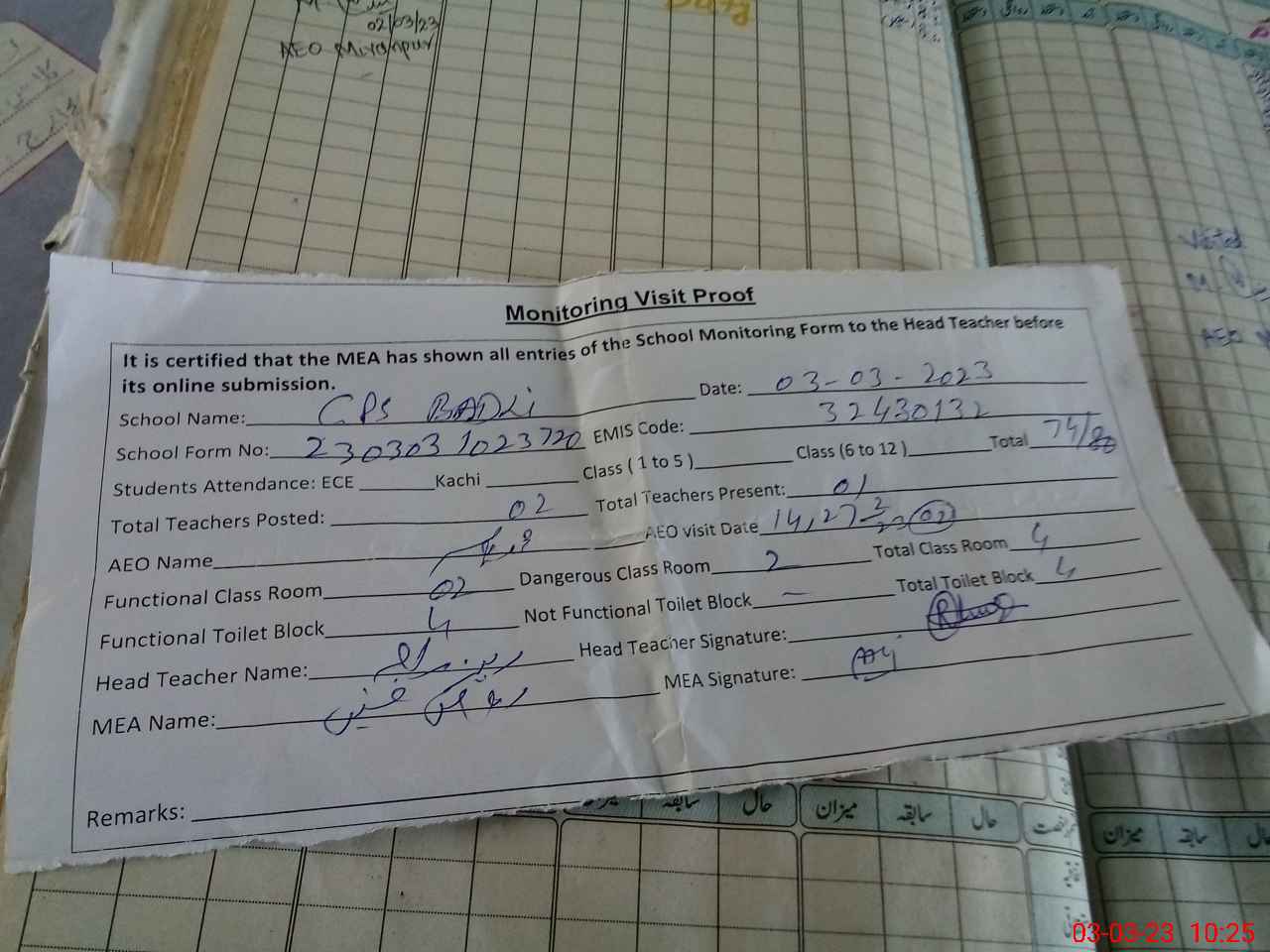 | Attendance Register | Head Teacher | MEA with School | Visit Proof |