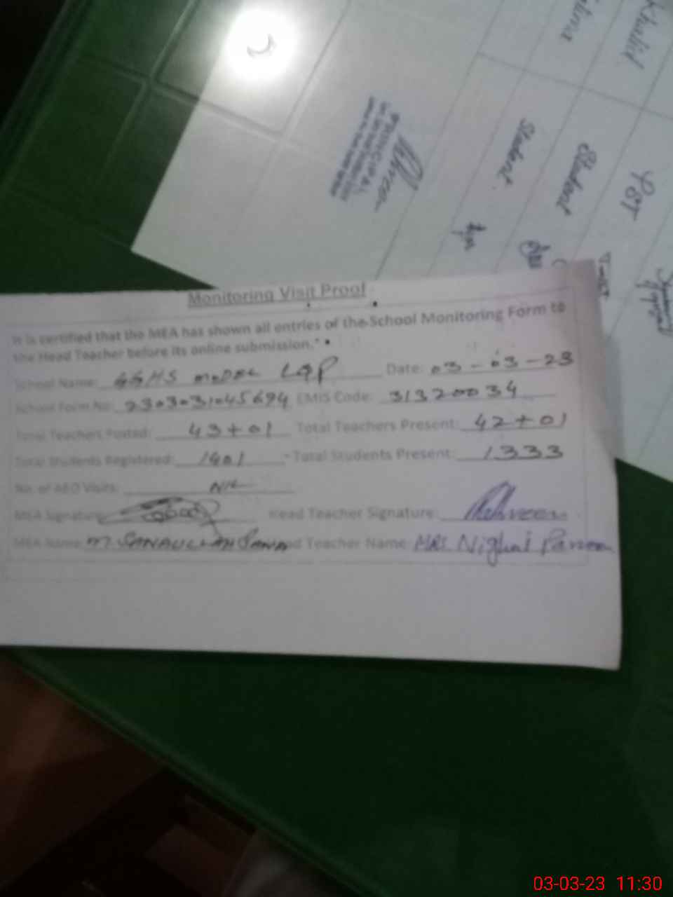 | Monitoring Date: 03-03-2023 | Start Time: 03-03-2023 10:45 AM | End Time: 03-03-2023 11:31 AM | Name of MEA: Mu**** Sa**** Ul**** Sa**** | |
