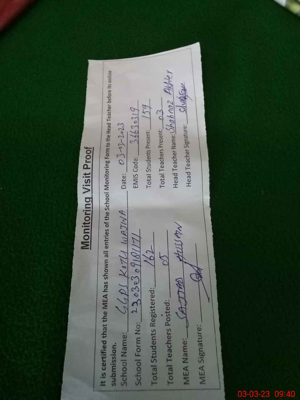 | Attendance Register | Head Teacher | MEA with School | Visit Proof |