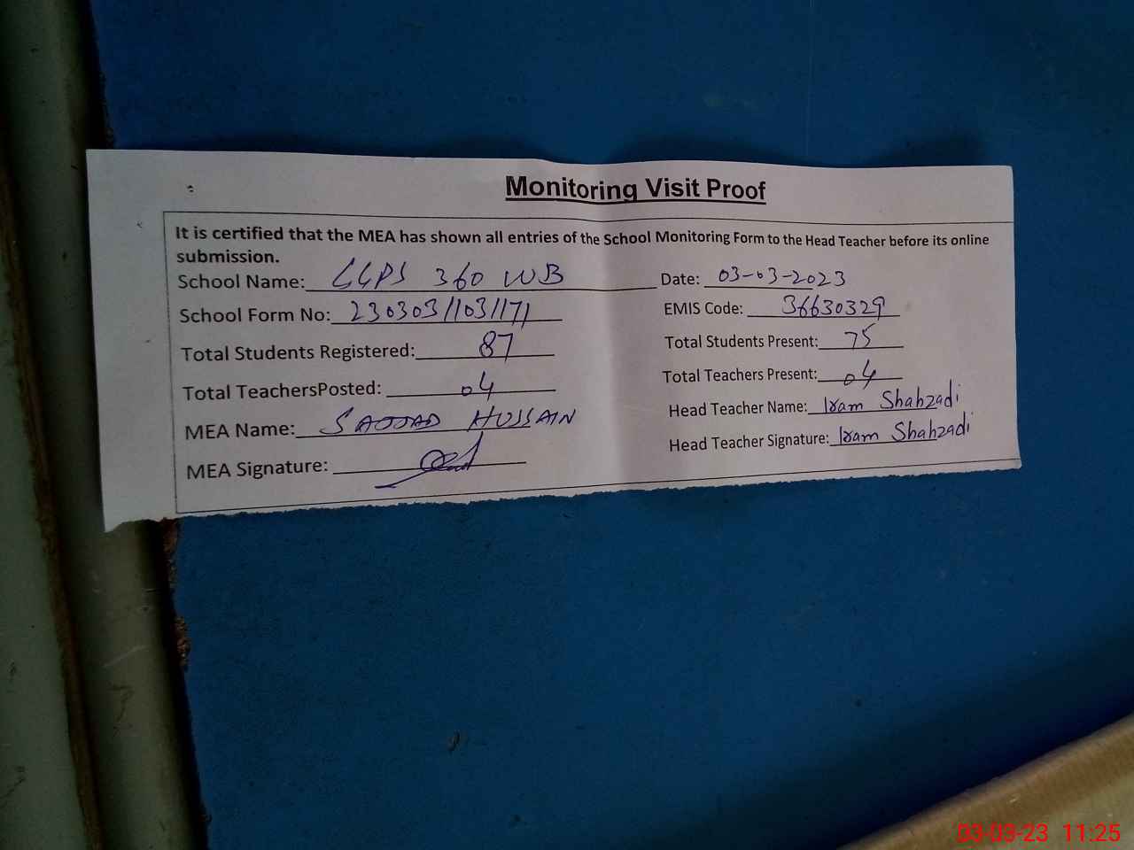 | Attendance Register | Head Teacher | MEA with School | Visit Proof |