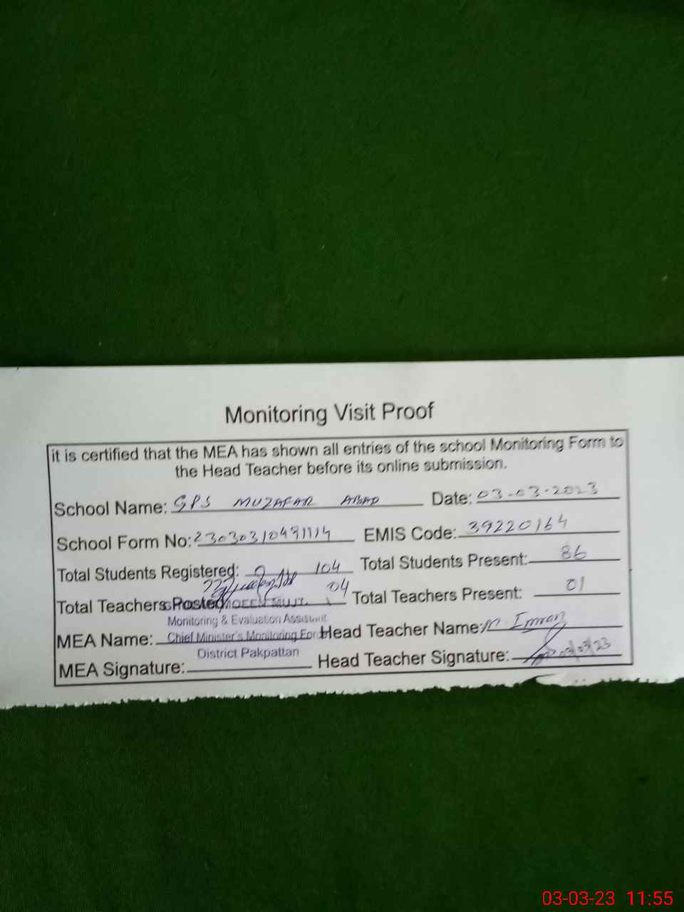 | Attendance Register | Head Teacher | MEA with School | Visit Proof |
