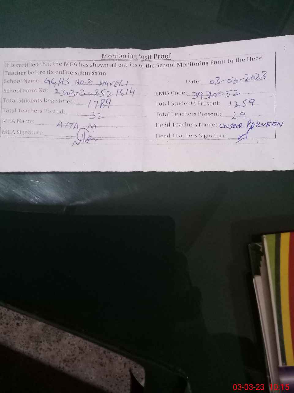 | Attendance Register | Head Teacher | MEA with School | Visit Proof |