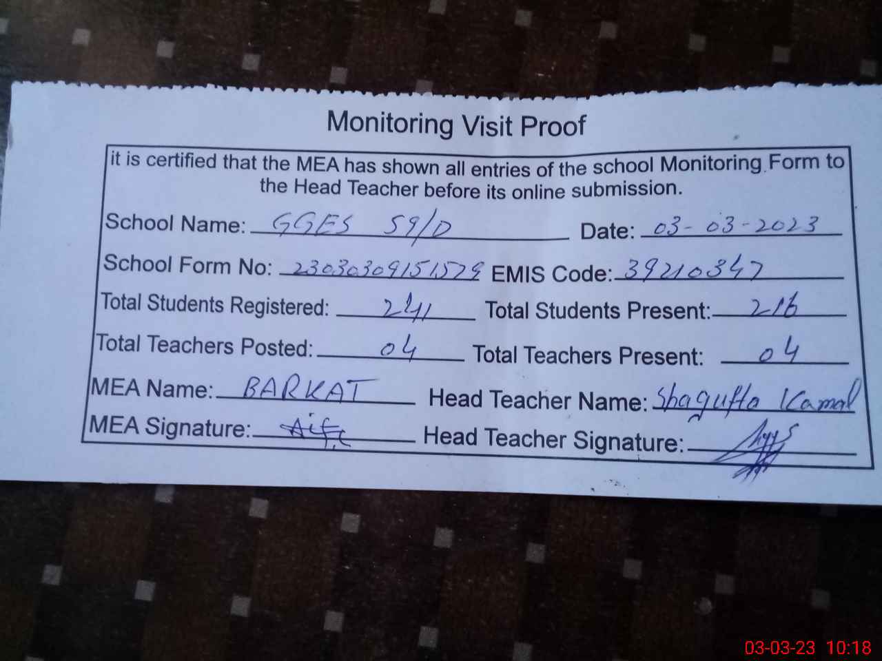 | Attendance Register | Head Teacher | MEA with School | Visit Proof |
