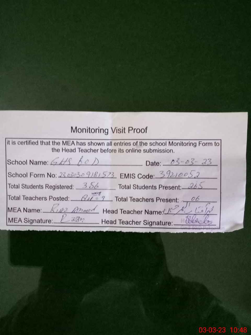 | Certified that this School was Inspected by the Undersigned MEA/DMO Today and the Information Stated Above is as Per Record. | |||||
