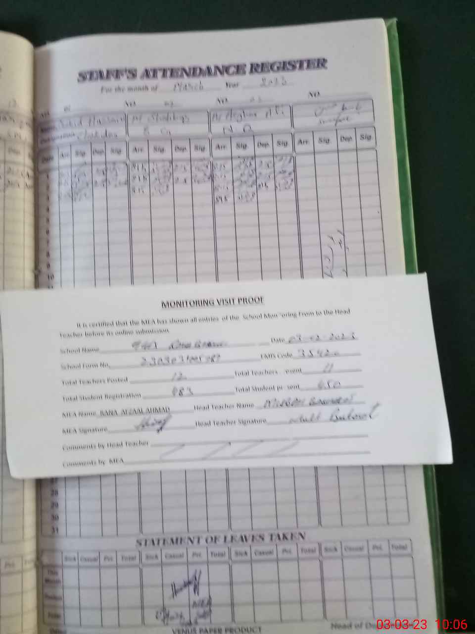 | Attendance Register | Head Teacher | MEA with School | Visit Proof |