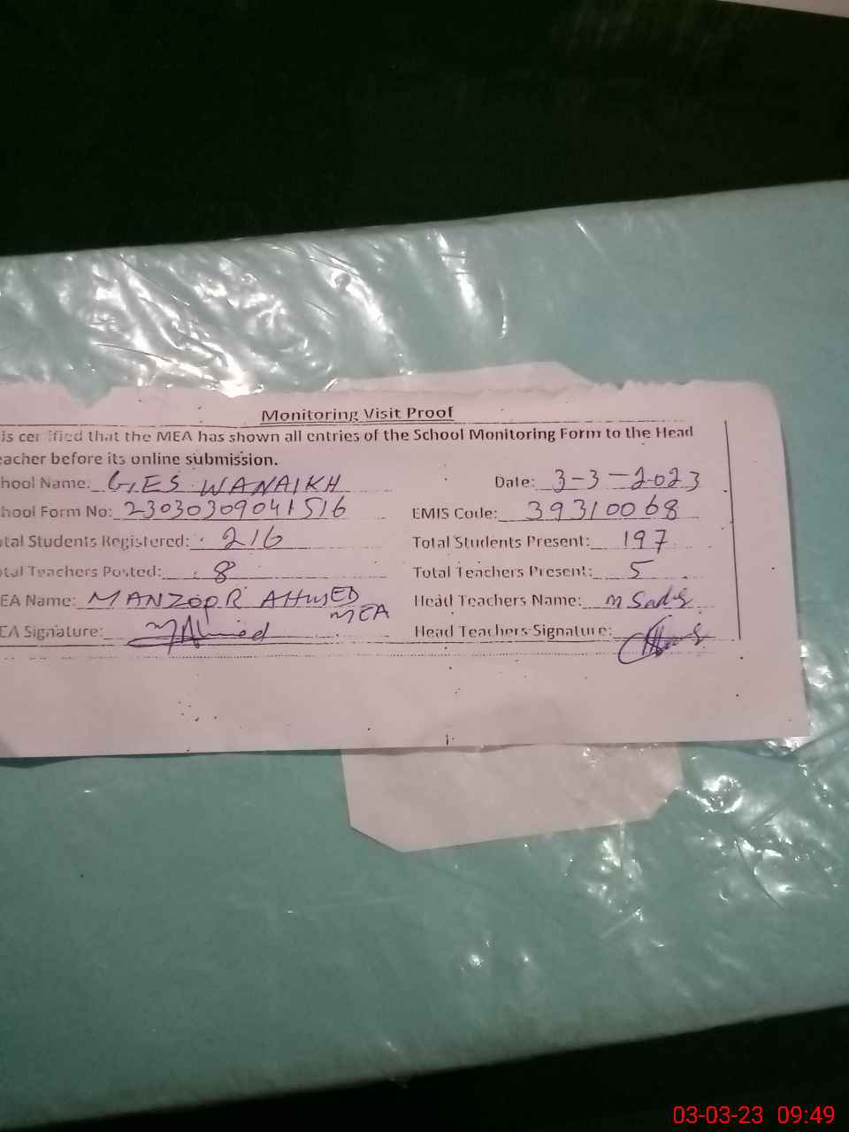 | Attendance Register | Head Teacher | MEA with School | Visit Proof |