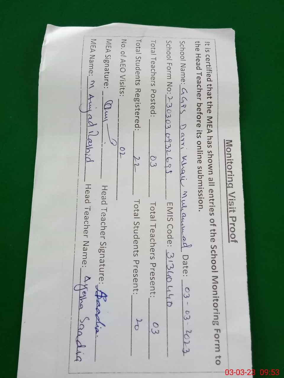 | Attendance Register | Head Teacher | MEA with School | Visit Proof |