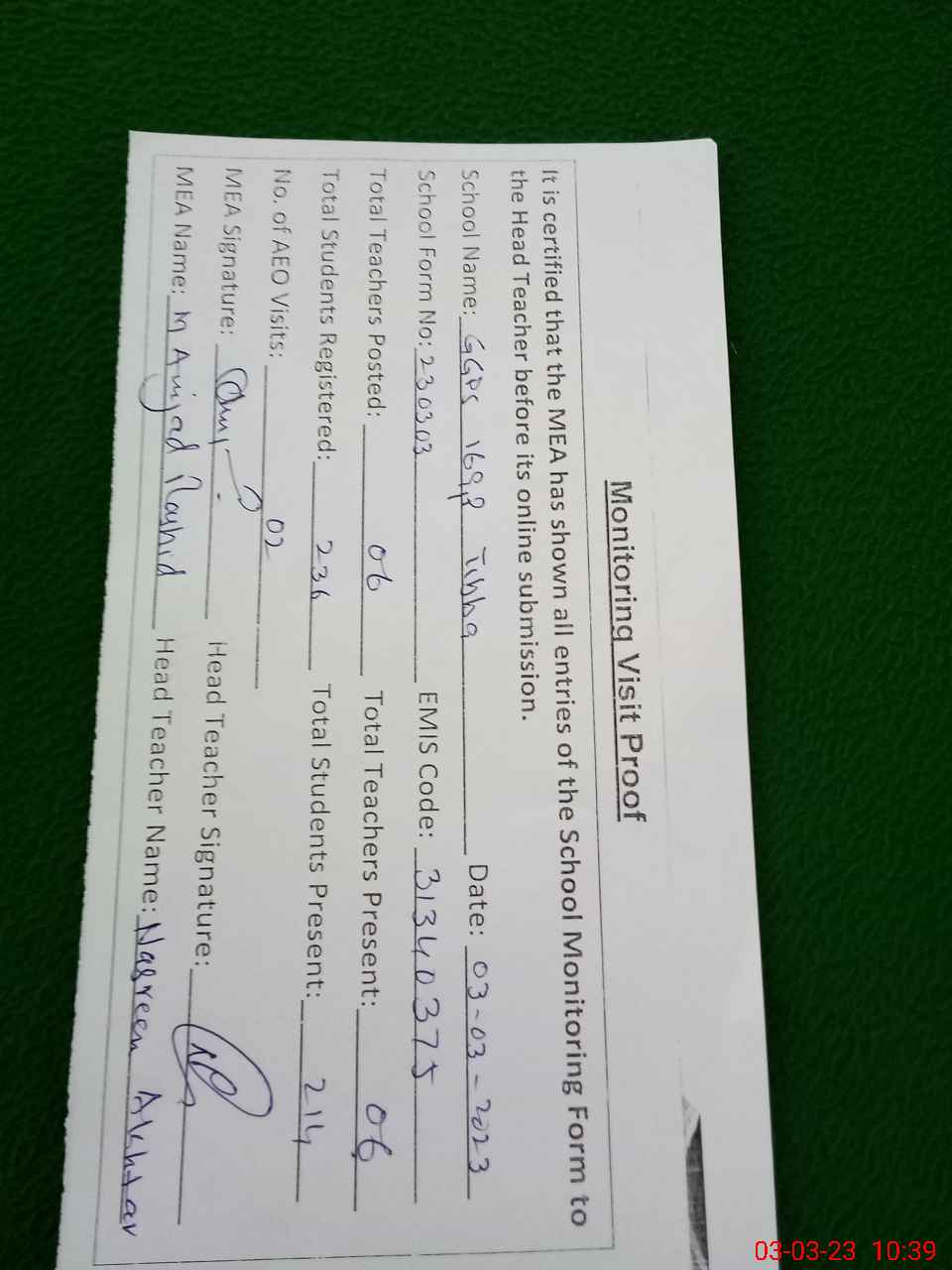 | Certified that this School was Inspected by the Undersigned MEA/DMO Today and the Information Stated Above is as Per Record. | |||||