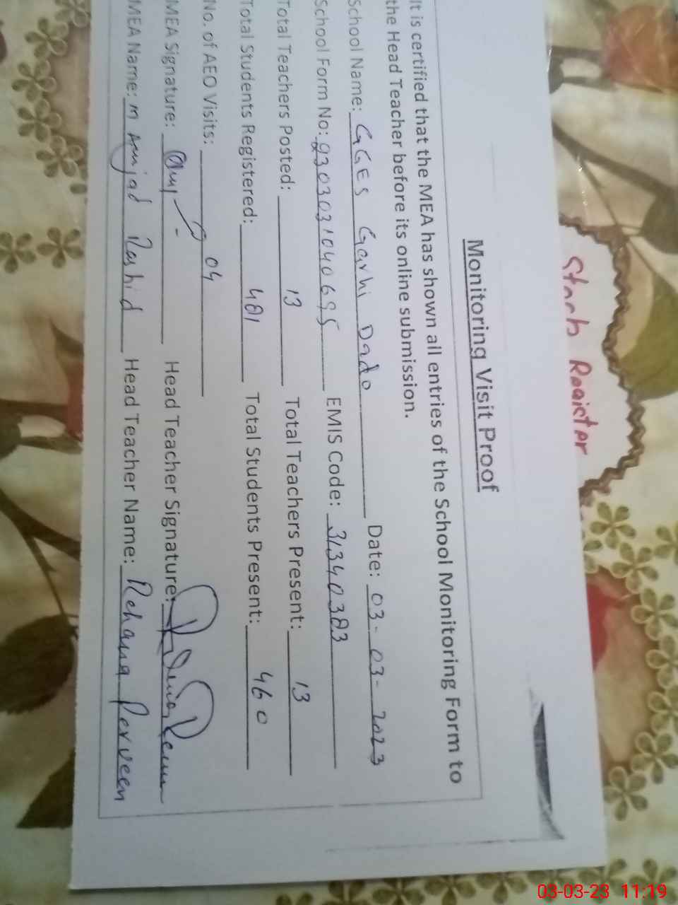| Attendance Register | Head Teacher | MEA with School | Visit Proof |