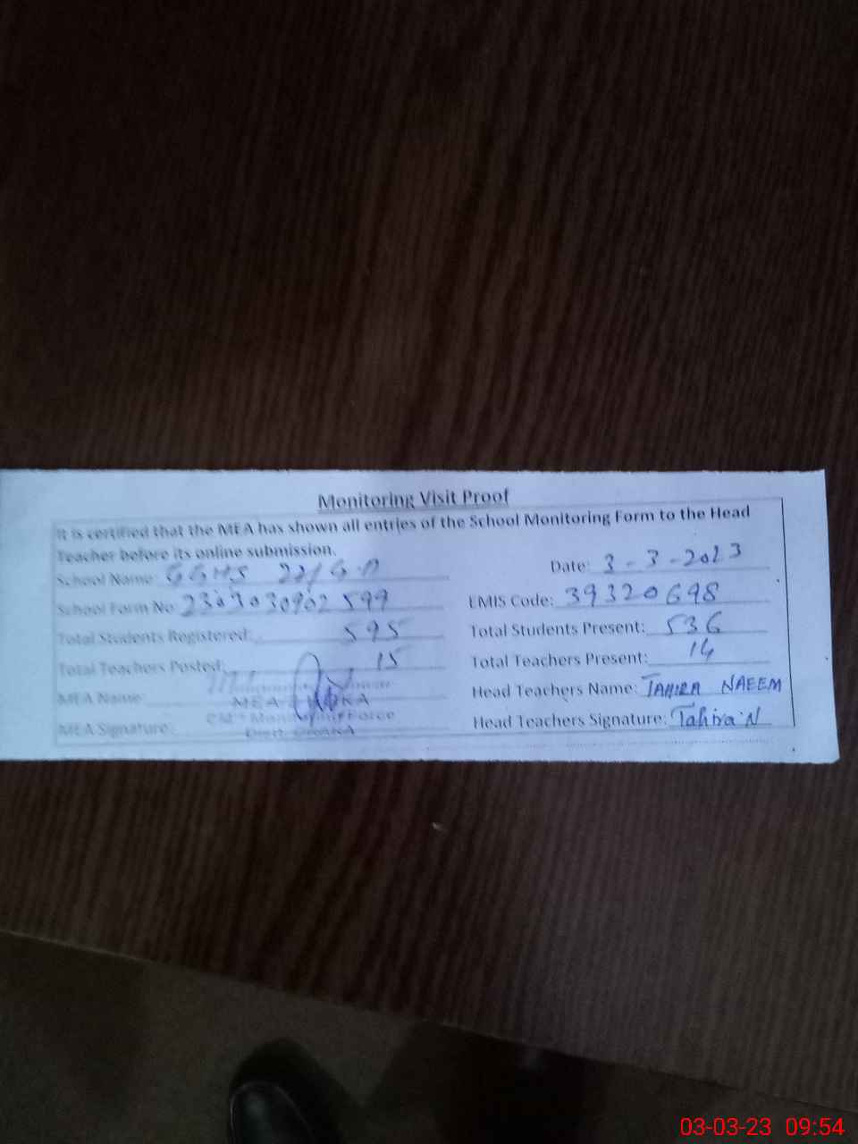 | Attendance Register | Head Teacher | MEA with School | Visit Proof |