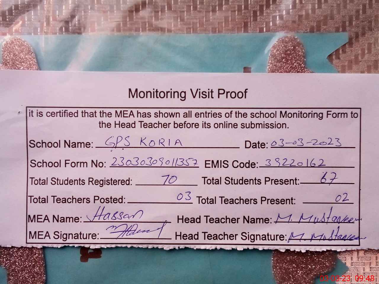 | EMIS Code: 39220162 | Name of School: GPS KORIA | |||