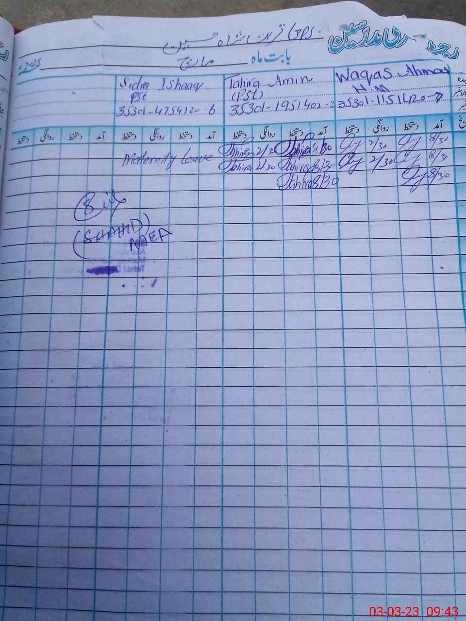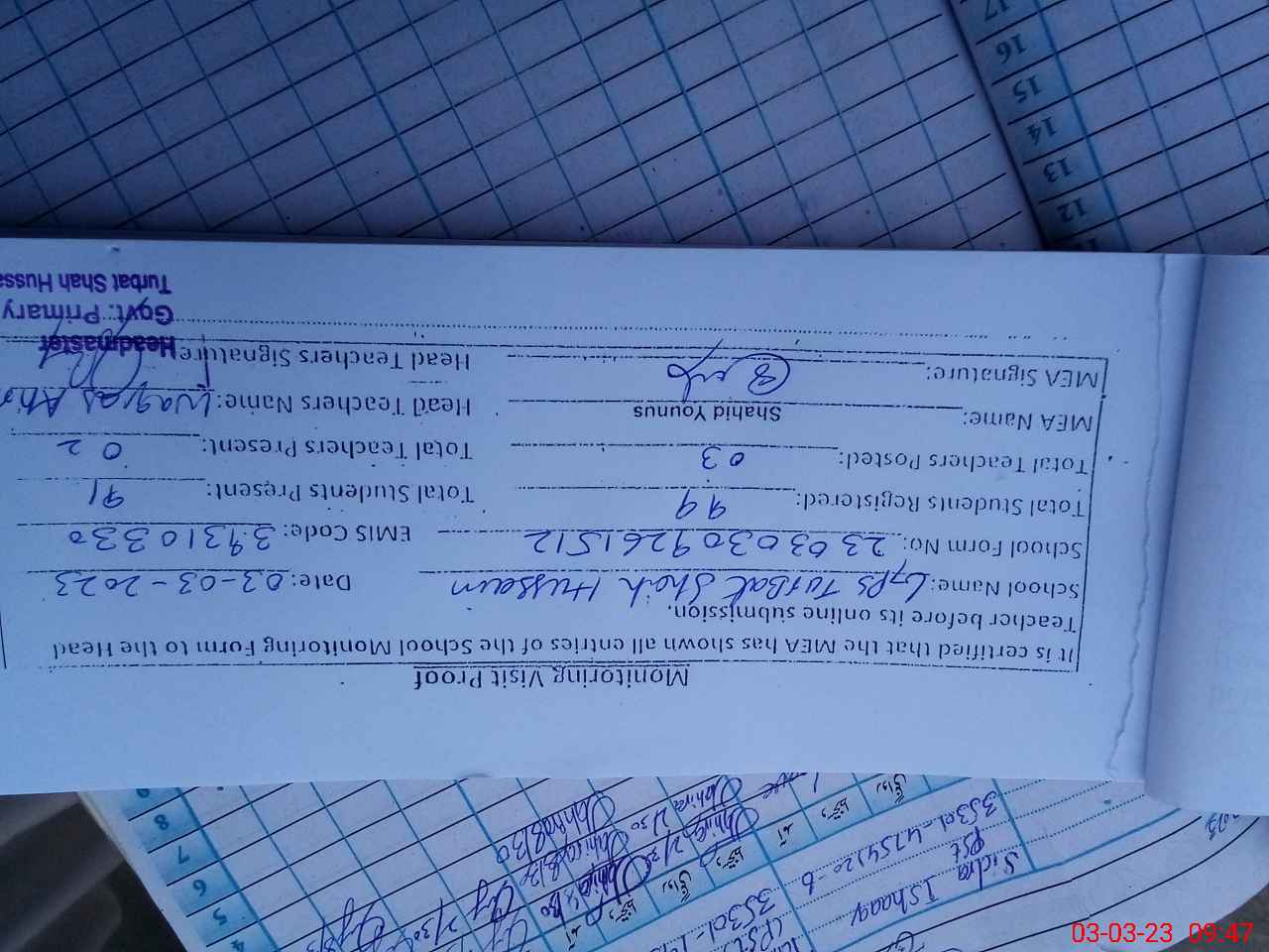 | Name: SI**** IS**** Designation: (School Headmaster's/Headmistress's) PST Phone/Cell Number: 03**** |