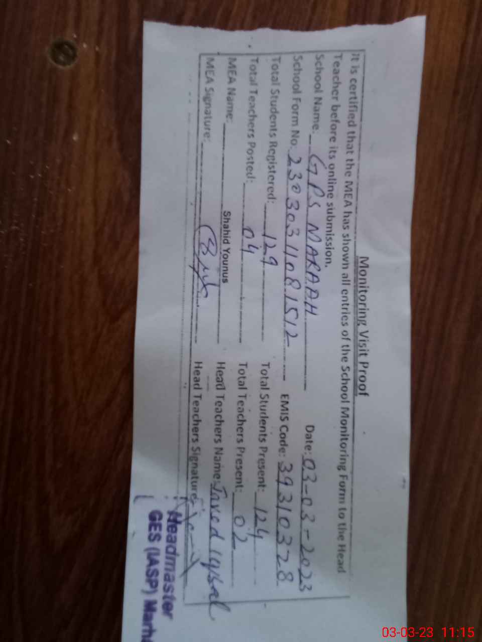 | Attendance Register | Head Teacher | MEA with School | Visit Proof |