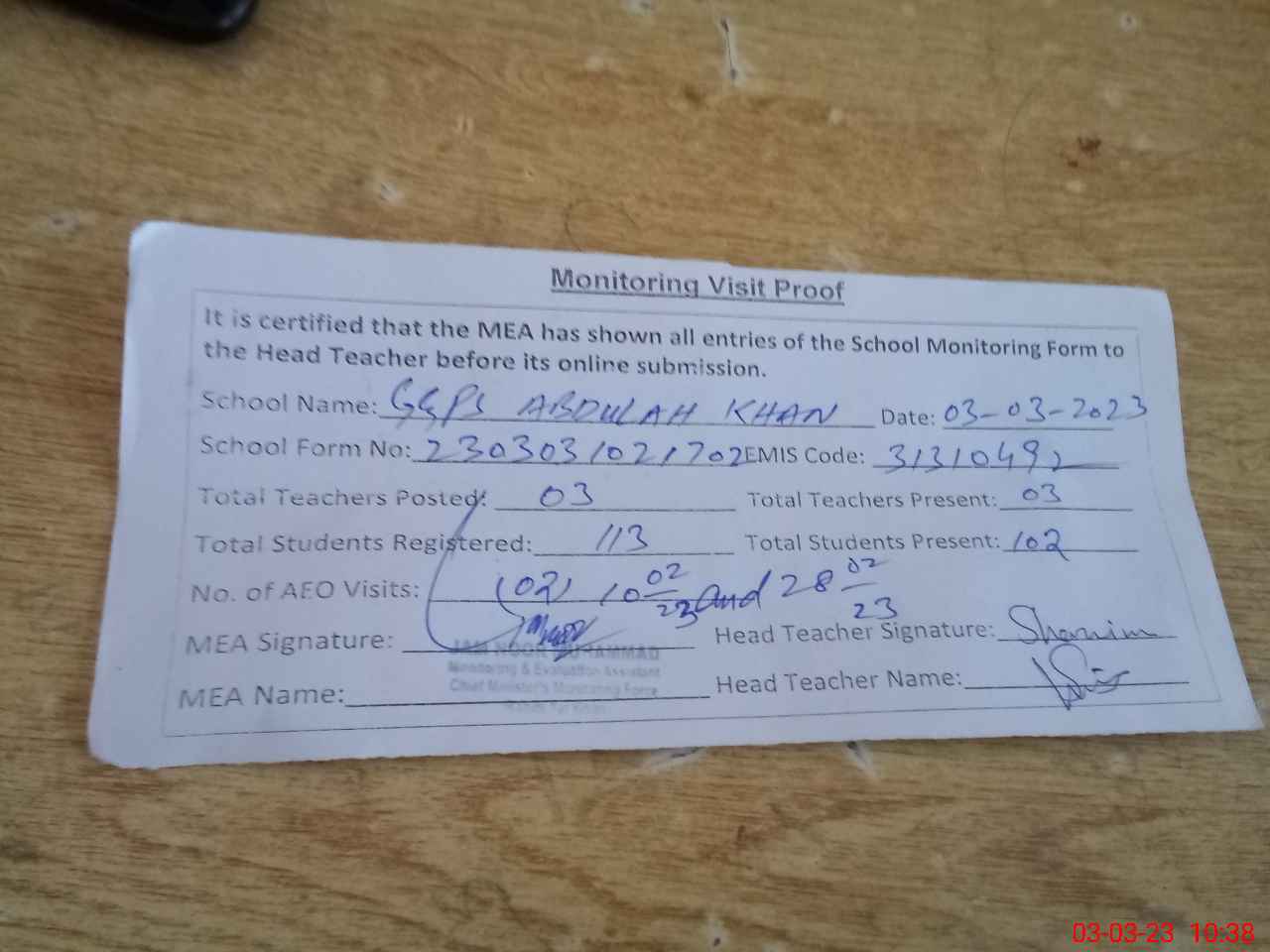 | Attendance Register | Head Teacher | MEA with School | Visit Proof |