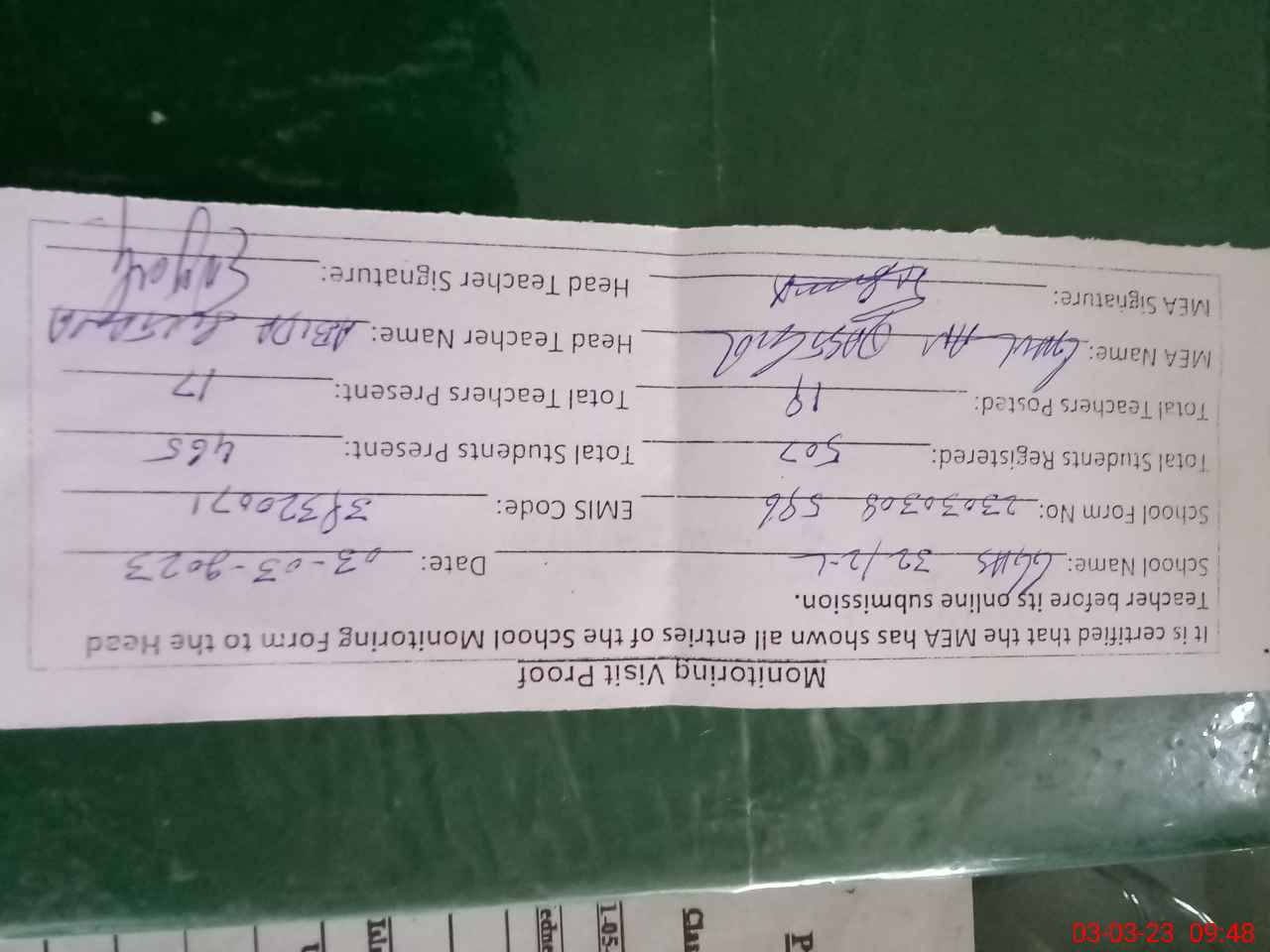 | Attendance Register | Head Teacher | MEA with School | Visit Proof |