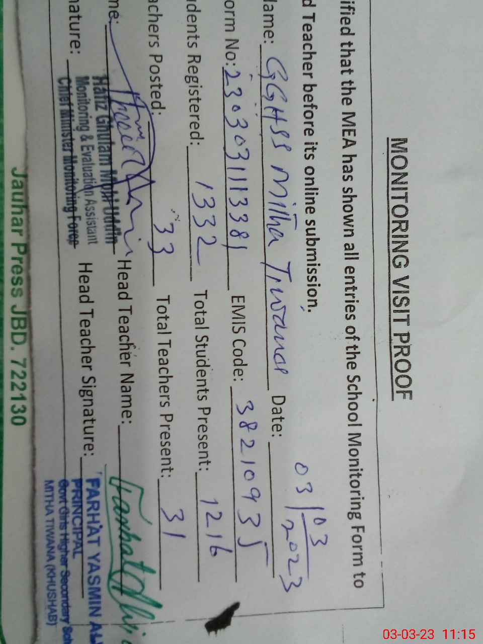 | EMIS Code: 38210935 | Name of School: GGHSS MITHA TIWANA | |||