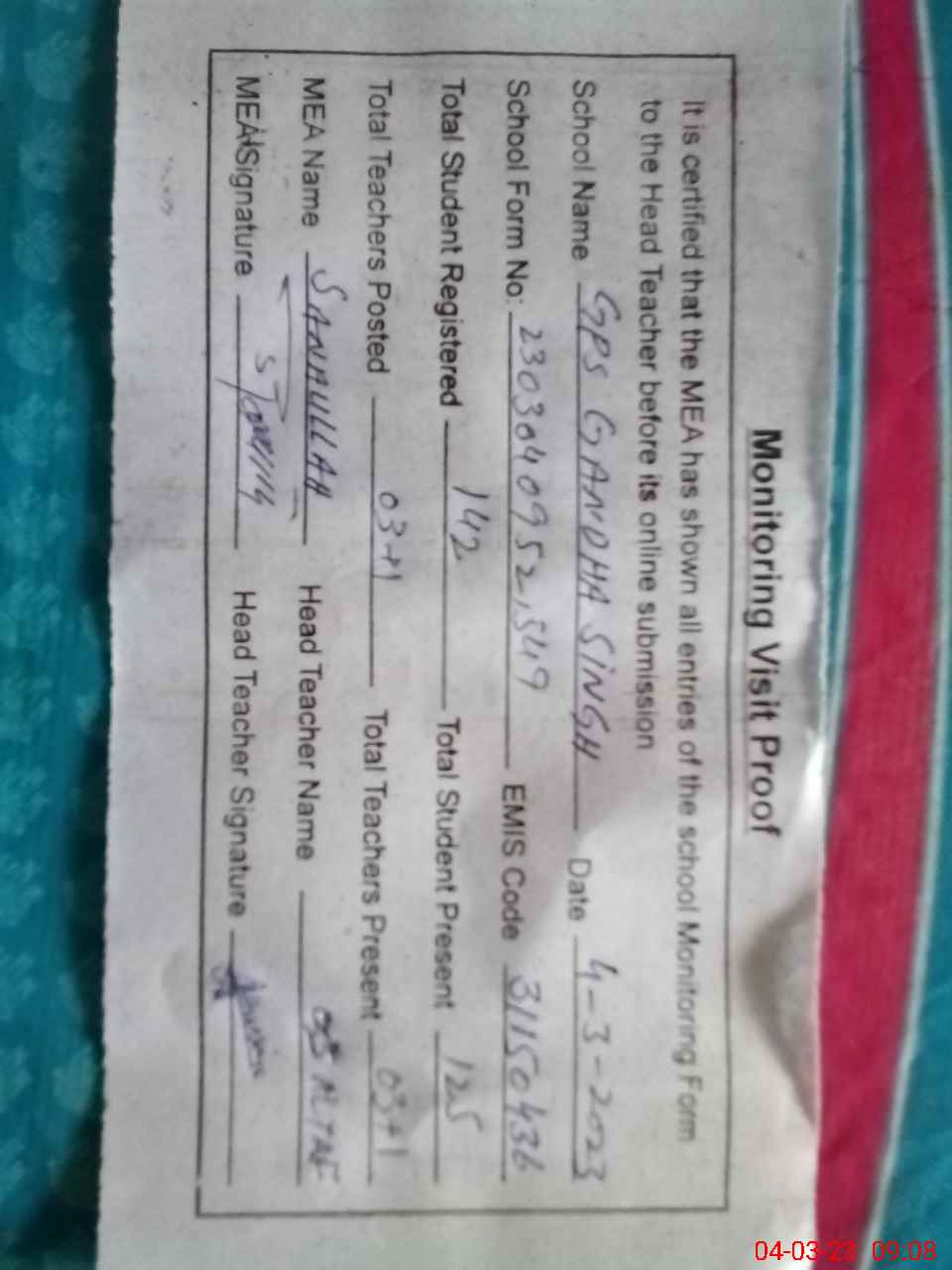 | Attendance Register | Head Teacher | MEA with School | Visit Proof |