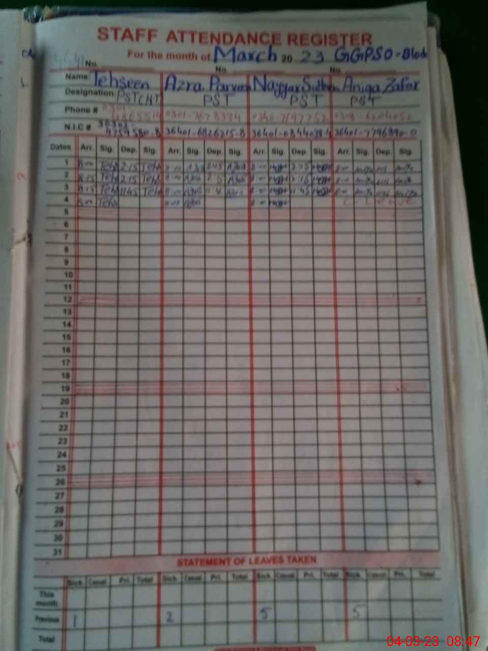 | Name: AZ**** PA**** Designation: (School Headmaster's/Headmistress's) PST Phone/Cell Number: 03**** |