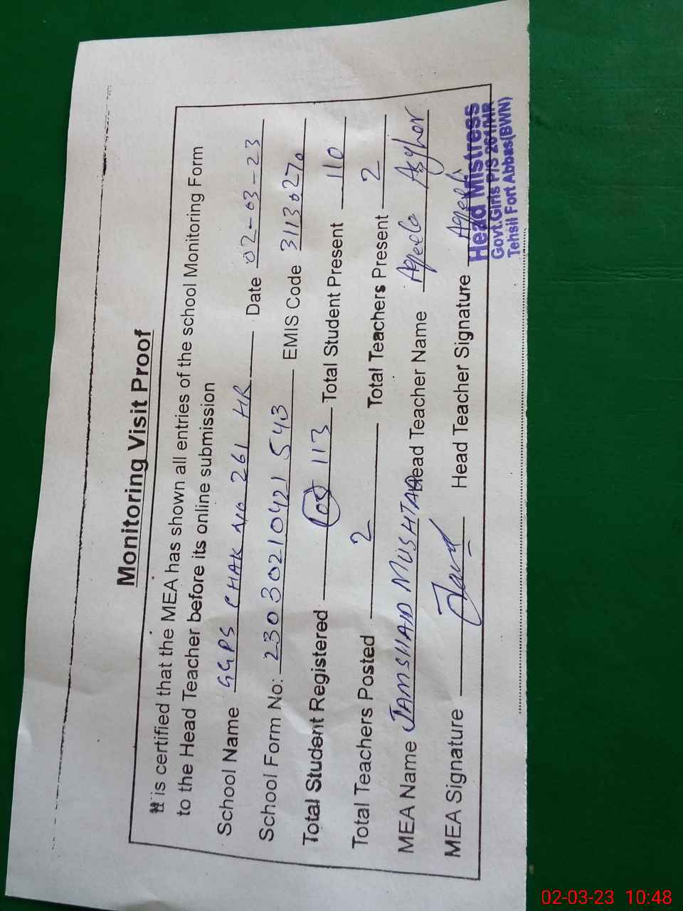| Attendance Register | Head Teacher | MEA with School | Visit Proof |