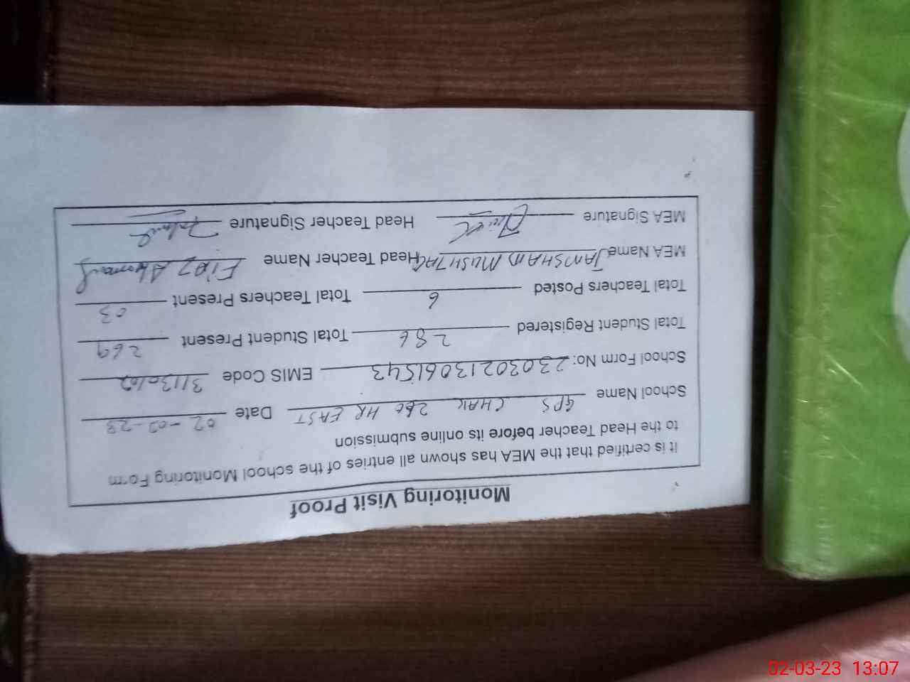 | Attendance Register | Head Teacher | MEA with School | Visit Proof |