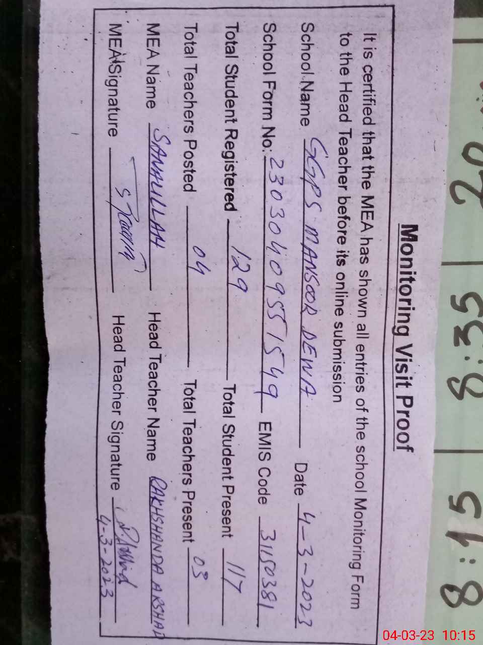 | Attendance Register | Head Teacher | MEA with School | Visit Proof |