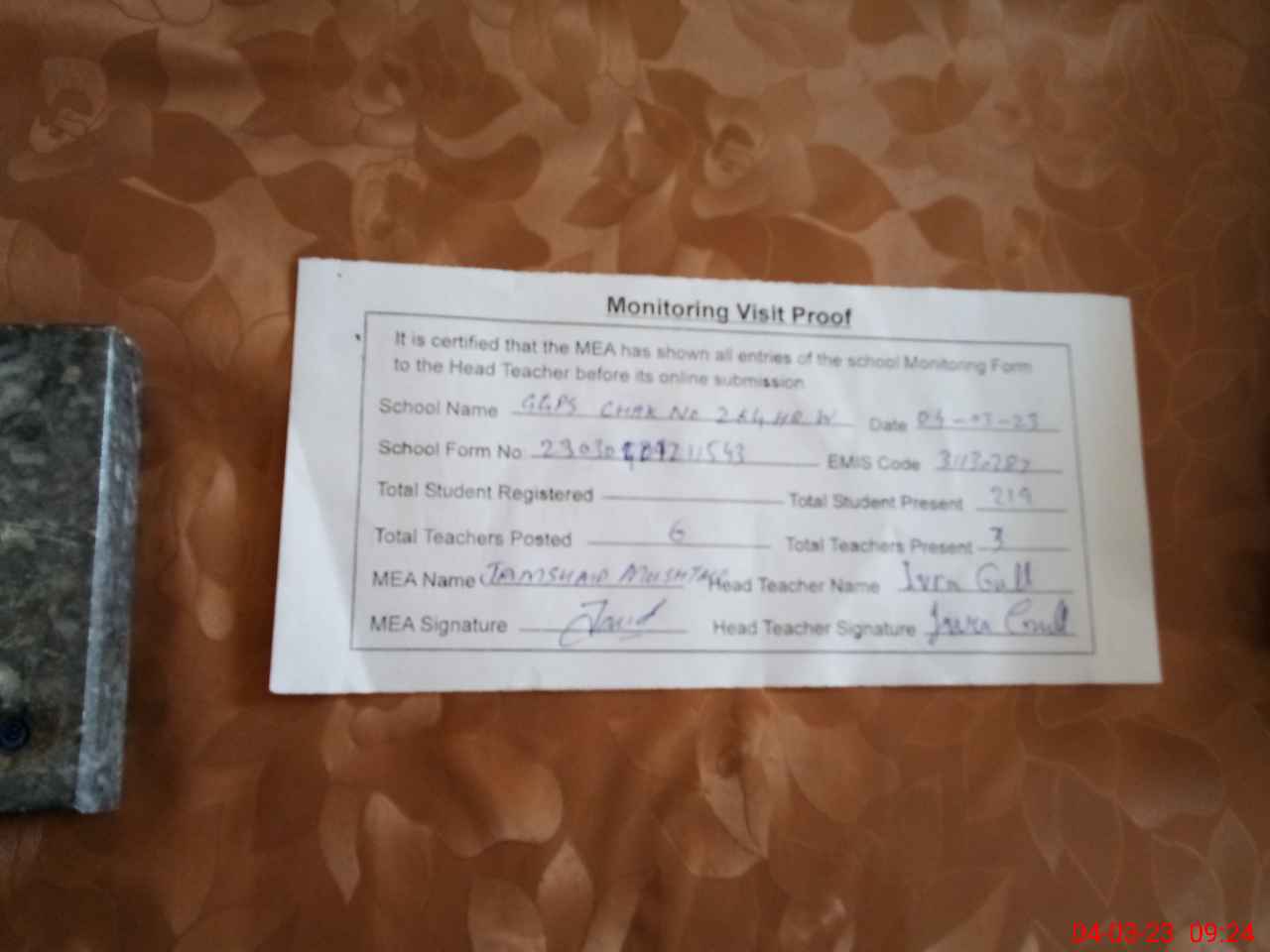 | Attendance Register | Head Teacher | MEA with School | Visit Proof |