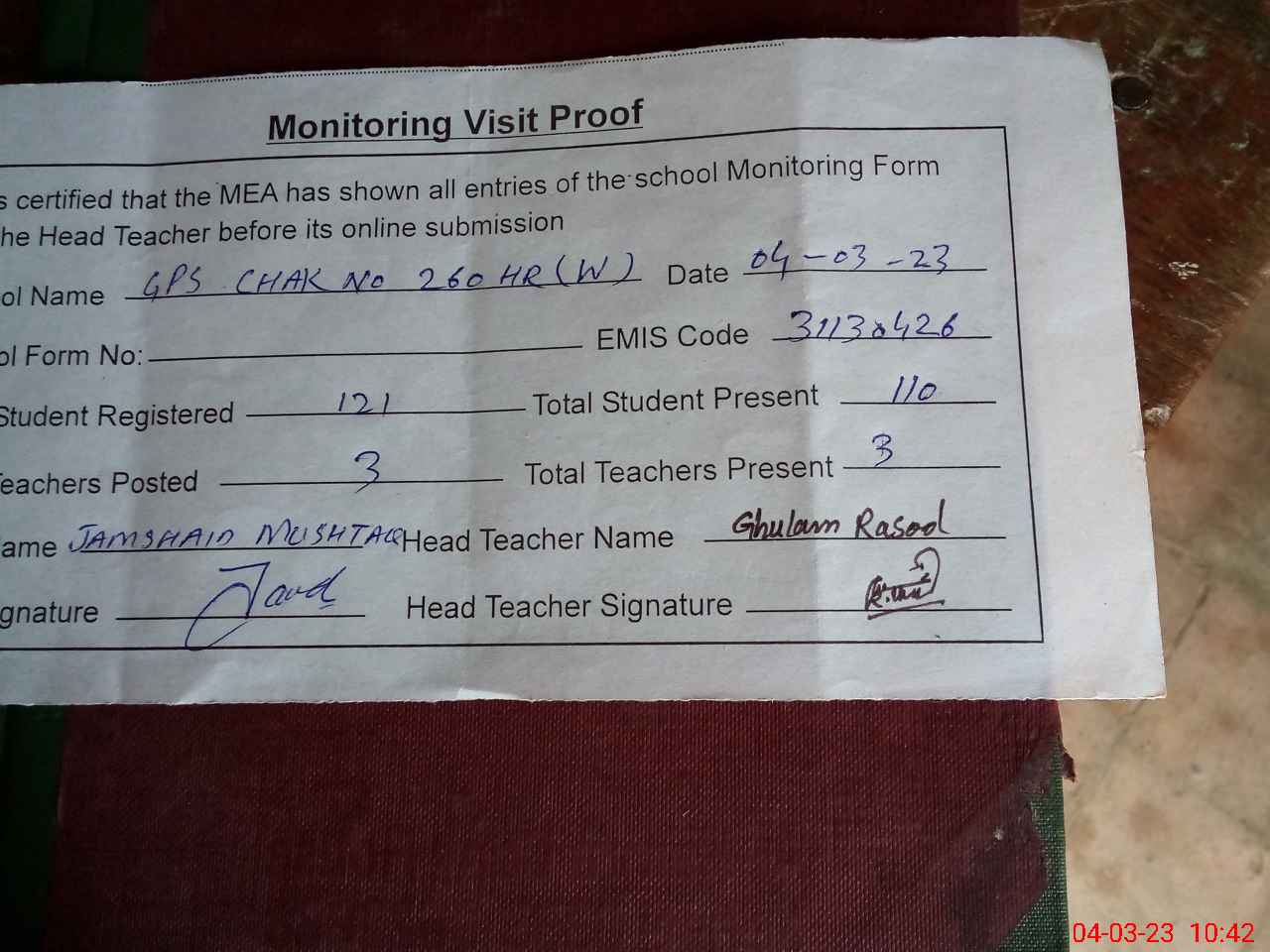 | EMIS Code: 31130426 | Name of School: GPS CHAK NO.260/HR WEST | |||